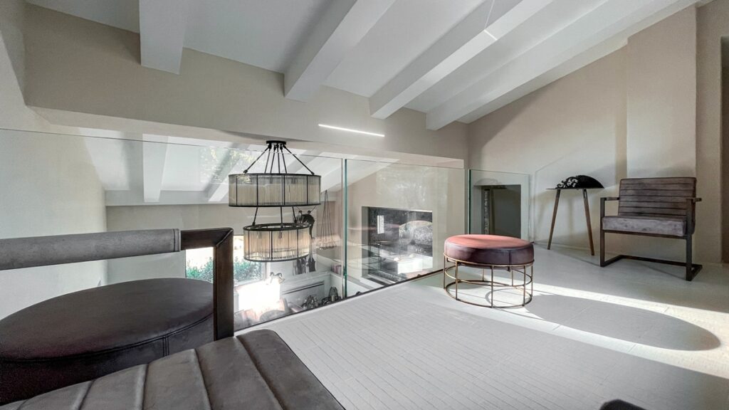 All’ingresso, la villa accoglie con un ampio ambiente open space che unisce cucina, zona living e area conviviale, creando uno spazio luminoso e perfetto per vivere momenti condivisi. Sopra la cucina si sviluppa un elegante soppalco con angolo lettura, che affaccia sul soggiorno sottostante e offre uno spazio più raccolto per momenti di relax. Accanto alla cucina si trova un bagno di servizio con zona lavanderia, mentre un corridoio conduce alle quattro camere da letto, tutte dotate di bagno en suite, e all’ingresso della piscina interna. Quest’ultima è collocata in una posizione rialzata rispetto alla zona giorno, garantendo un elevato livello di privacy e rendendo l’esperienza ancora più esclusiva. Due delle camere dispongono di accesso diretto verso l’esterno attraverso ampie vetrate, permettendo di vivere fin dal risveglio il contatto diretto con la valle e i vigneti circostanti. L’intera villa è caratterizzata da uno stile contemporaneo, lineare ed elegante, dove ogni ambiente è progettato per valorizzare la luce naturale e il paesaggio. Sullo stesso piano del salone troverete una sala lavanderia, un salottino distaccato con un enorme divano e maxischermo, un bagno di servizio e il corridoio che porta a 3 delle camere da letto della Villa, da qui troverete anche una scala in pietra serena che conduce al piano superiore al quale potrete accedere anche tramite una porta che si affaccia sul versante superiore della proprietà, su questo piano troverete 4 camere da letto. In totale la Villa conta 7 camere da letto ognuna dotata di bagno en suite. All'esterno di Villa Il Tinaio troverete un parcheggio per 7 automobili, una grande piscina infinity con vista sulla vallata, affiancata da un grande prato inglese che unisce la piscina con lo spazio adiacente il salone, nel quale troverete un grande tavolo di legno e dei comodi divanetti con dei splendidi ombrelloni e il barbeque definendosi spazio perfetto per giornate insieme all'insegna di buon cibo e divertimento. Sono presenti numerosi terrazzamenti che disegnano il giardino della proprietà dando simmetria e ed eleganza classico dei giardini all'italiana, lo spazio è disegnato per seguire l'andamento discendente della vallata garantendo comodi spazi e rendendo agevole l'esplorare i dintorni della proprietà.